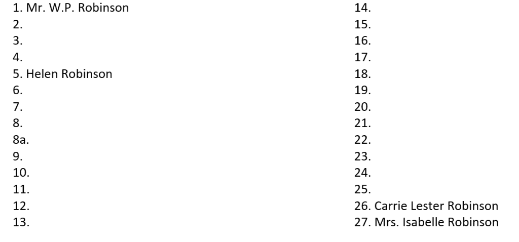 Now with a list of names I was stunned to find a beautiful, clear photo of children at the Home. I believe this was near the same time as the 1915 census. W.P. Robinson on the left and Mrs. Isabelle Robinson on the right. Randall & Carrie Robinson and Helen Robinson also. Can you identify anyone else in the picture?