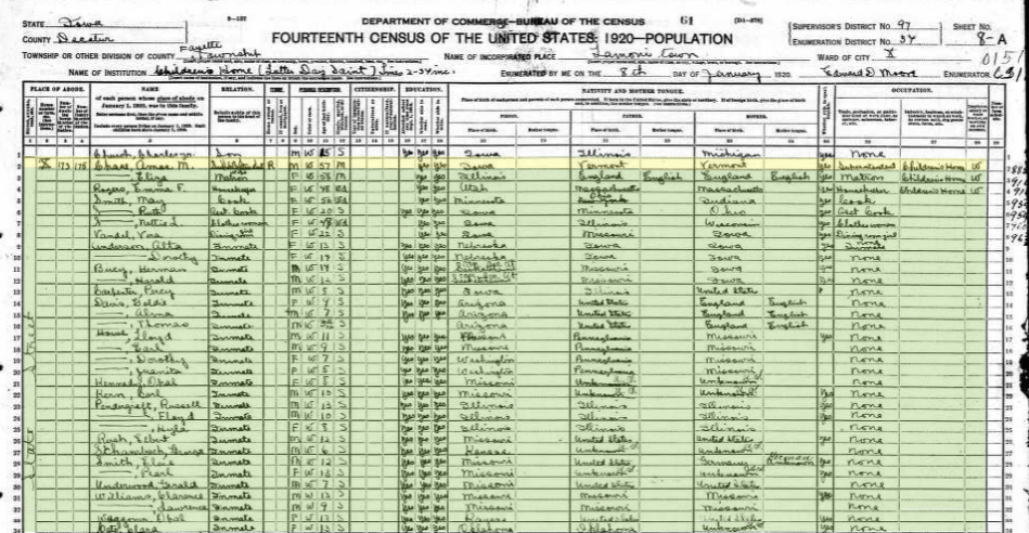 1920 US Iowa, Decatur, Fayette Township, Children’s Home (Latter Day Saints) p. 8-A