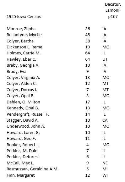 After finding the 1915 state census list (see last blog) of the Home in Lamoni, Iowa, I looked at other census years. Here are 26 names from the 1920 US Census. Note the enumeration district now lists the Home in Fayette Township which includes Lamoni.