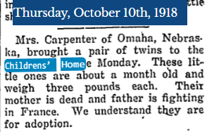 A 1913 report in the Lamoni Chronicle told of a pair of twins arriving at the Home due to death of mother and the father is fighting in France.