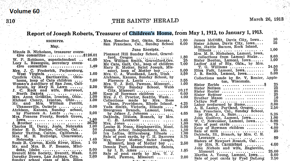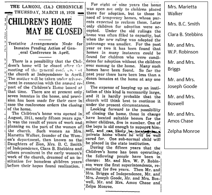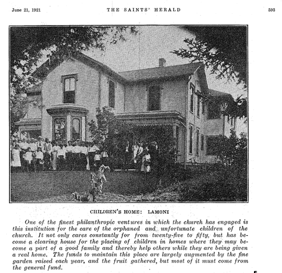 Saints’ Herald v 62, April 14, 1915, p. 368 “The children of the Home of school age have attended school in the public schools of Lamoni. Since the home was started there have been 33 applications for children. Twelve have been placed in homes, and 3 of these have been returned. The number of children in the home on this date is 22; 11 girls and 11 boys, ages 2 years to 17 years.”