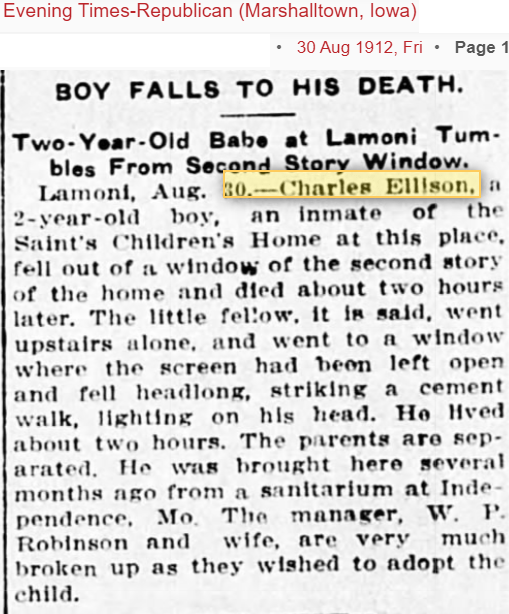 30 Aug 1912 Charles Ellison, a two-year-old boy, an inmate of the Saint’s Children’s home at this place, fell out of a window of a second story of the home and died about two hours later. [Quad-City Times (Davenport, IA) and The Gazette (Cedar Rapids, IA)] The parents are separated He was brought here several months ago from a sanitarium at Independence, MO. The Robinsons wished to adopt the child. [Evening Times-Republican (Marshall, IA), p. 1]