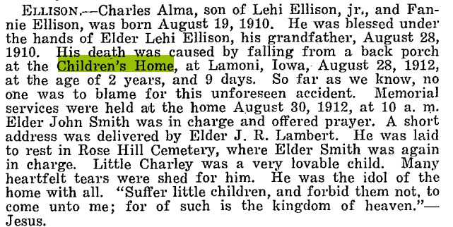 Here is the grave of Charlie Alma Ellison at the Rose Hill Cemetery, Lamoni, Iowa. On Findagrave.com indexed as Charley Alma Ellison 19 Aug 1910 – 28 Aug 1912. Plot 699, Grave 1 Memorial ID 163507188.