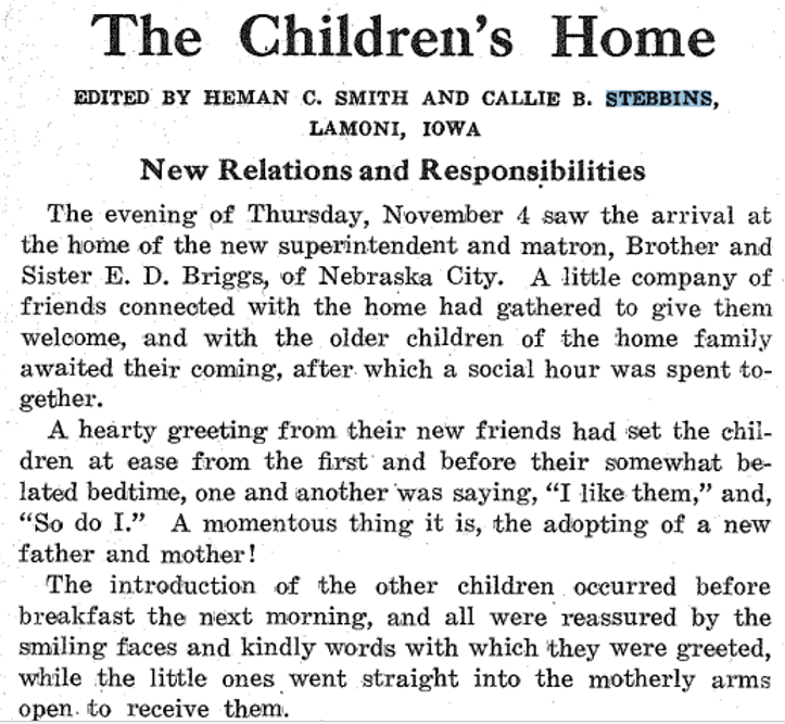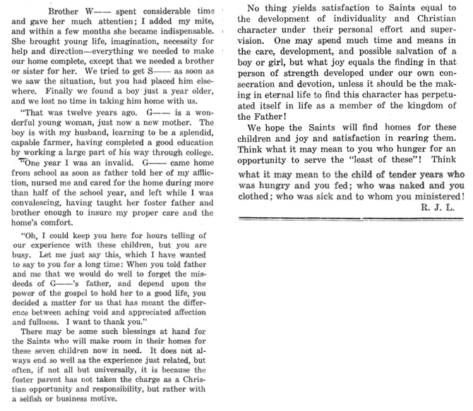The following 1927 Saints’ Herald article reflected back on a positive adoption experience from the Home. It also emphasizes the “good work” accomplished by taking in a child into a members home.