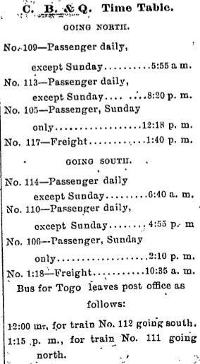 There were 4 passenger trains daily on the CB&Q. 17 Aug 1911 The Lamoni Chronicle (Lamoni, IA) p1
