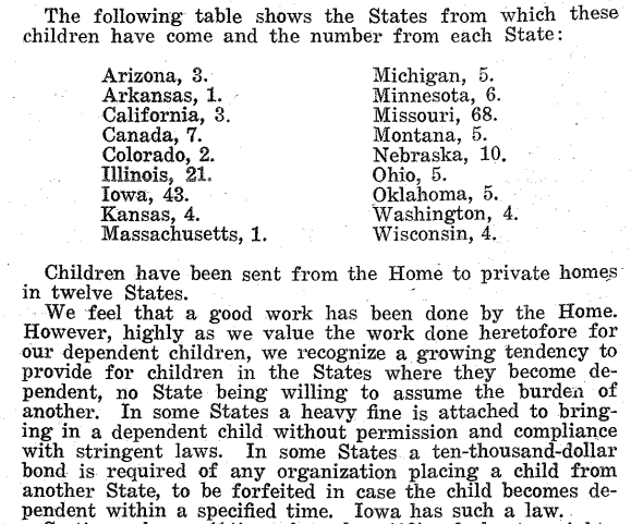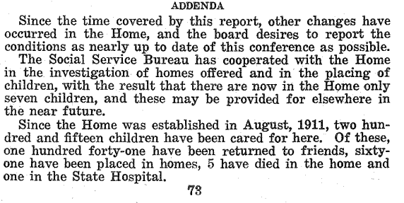 “Since the Home was established in August 1911, two hundred and fifteen children have been cared for here. Of these, one hundred forty-one have been returned to friends, sixty-one have been placed in homes, 5 have died in the home and one in the State Hospital.
