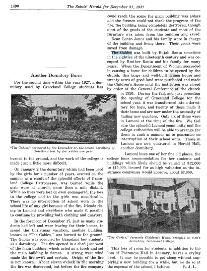 According to Graceland historian Enid DeBarthe “The Children’s Home discontinued operation in 1926 on recommendation of the Board of Trustees and with the approval of the Presidency, Twelve and Presiding Bishopric.” [Ch. Hist. Vol 8:76] The Home building was used by Graceland College as the Gables, it was destroyed by fire December 17, 1927.