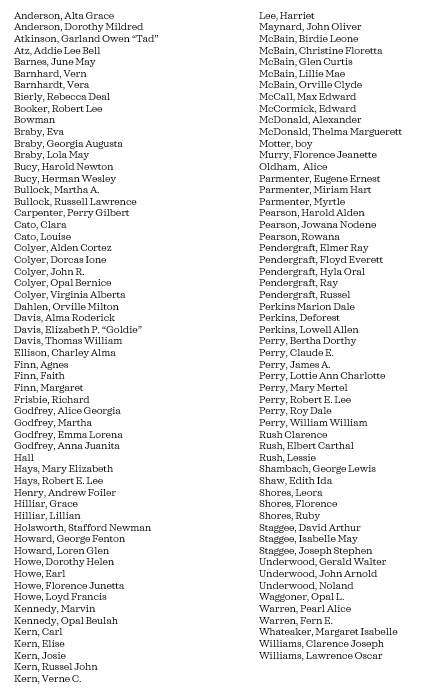 Name age born birthplace Atkinson, Garland 6 1908 WA Bullock, Martha 11 1904 IL Bullock, Russell 9 1906 IL Godfrey, Anna J. 10 1905 NE Godfrey, Emma L. 13 1902 NE Godfrey Martha J. 8 1907 NE Holdsworth, Stafford 11 1904 MO Hilliard, Grace 10 1905 IL Kern, Russell 11 1904 MO Kern, Verne C. 12 1903 MO Kern, W.J. 14 1901 MO Moffett, Jean Marie 16 1899 IA Perry, Claude E. 3 1912 MO Perry, James A. 9 1906 MO Perry, Lottie Ann 13 1902 MO Perry, Marg M. 8 1907 MO Perry, Robert L. 17 1898 MO Perry, Roy D. 4 1911 MO Perry, William W. 11 1904 MO Smith, Vada 9 1906 IL Warren, Fern E. 8 1907 MI Warren, Pearl A. 10 1905 MI