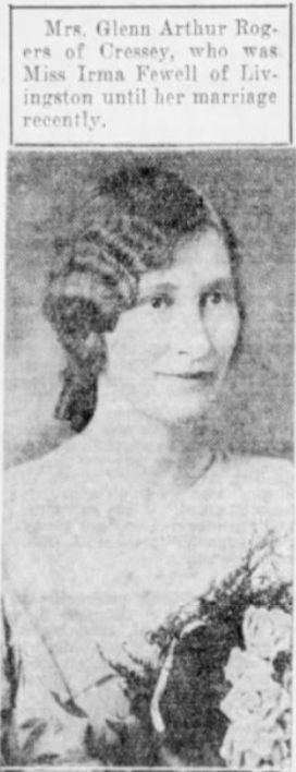 On 30 Aug 1931 she married Glenn Arthur Rogers at Turlock, Stanislaus, California. Irma was 23.
