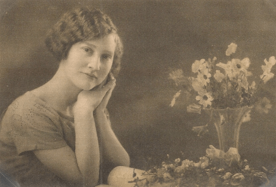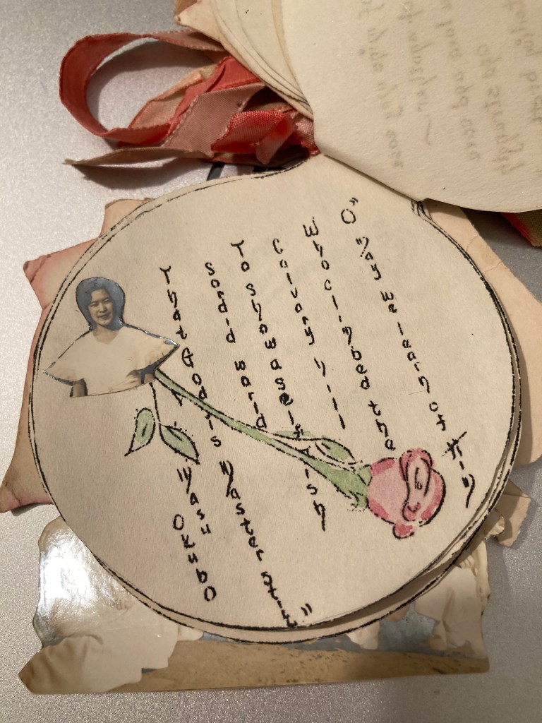 I found a small paper scrapbook in my grandmother’s belongings after she passed. I didn’t recognize any of the names, it wasn’t my family, so I wondered what to do with it? It was hand-made, very delicate, about 4 inches by 4 inches. The cover was flower shaped on thin, hand-colored paper. Tied with ribbon, each page had a photograph of a young woman along with her signature and a poem.
