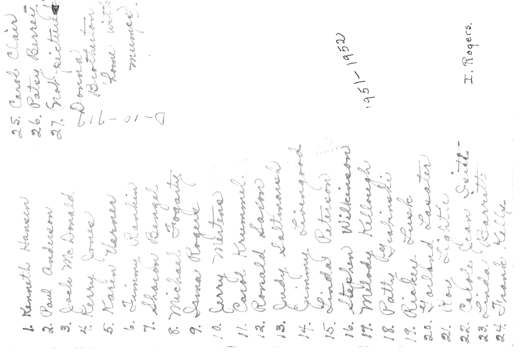 1951 – 52 Sharpstein School, First GradeHandwritten list of student names