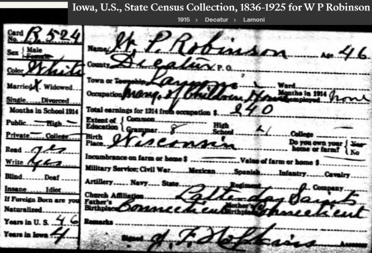 Ancestry family trees helped me learn that William Perry Robinson was born in Wisconsin. His parents were John B. & Serena S. Robinson. W.P. grew up at Oregon, Dane, Wisconsin.