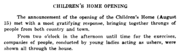 At the incorporation of the Children’s Home, “The purpose of the Home was to receive, adopt, care for, place out for adoption, and improve the condition of destitute, abandoned, abused, ill-treated, friendless and orphan children, to secure and own suitable ground and tract of land, to erect and maintain suitable buildings where such children may be provided for education.”