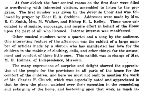 The Journal of History reported that in 1911, “Brother William P. Robinson was taken out of the missionary field (Wisconsin District) and placed in charge of the Children’s Home.” [rLDS Journal of History, Vol. 8 (1915) p. 220] There are several photos of the home on opening day.