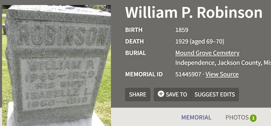 The 1920 US Census puts William P. Robinson age 60 living at 131 S. Willis, Independence, Jackson, MO. His occupation is Preacher. His daughter Helen I. age 36 is working clerical office. Clyde P. age 7 is with the family. His wife Isabelle had died in 1918.